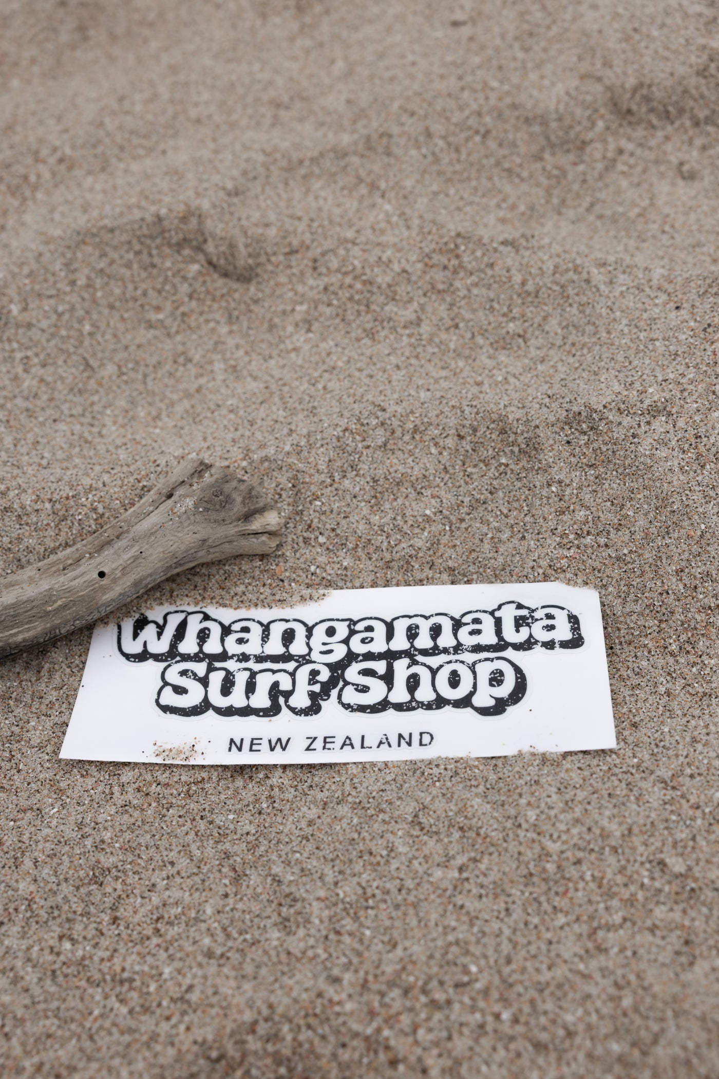 WHANGAMATA SURF SHOP BUBBLE LOGO STICKER - WHITE BASE W/ BLACK PRINT