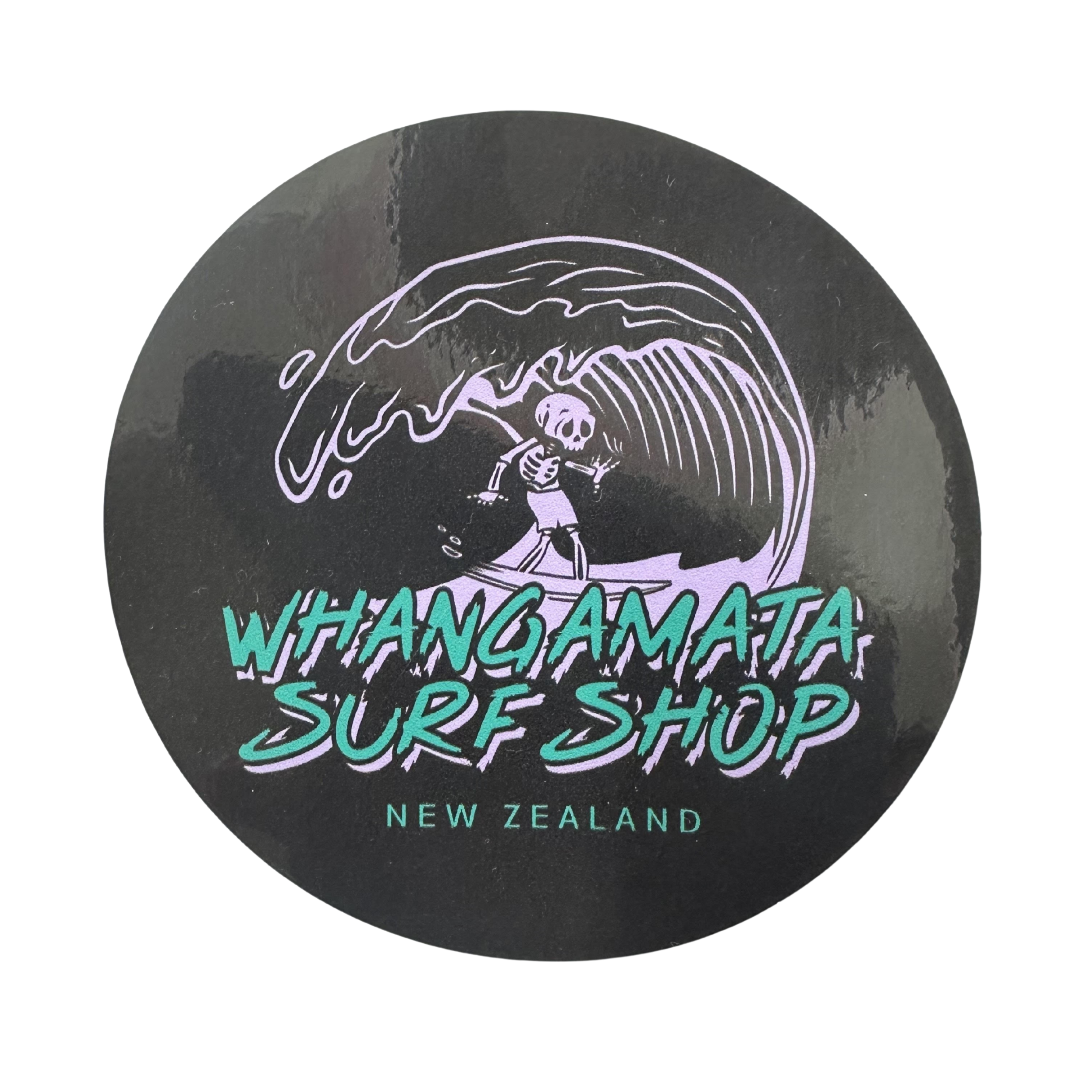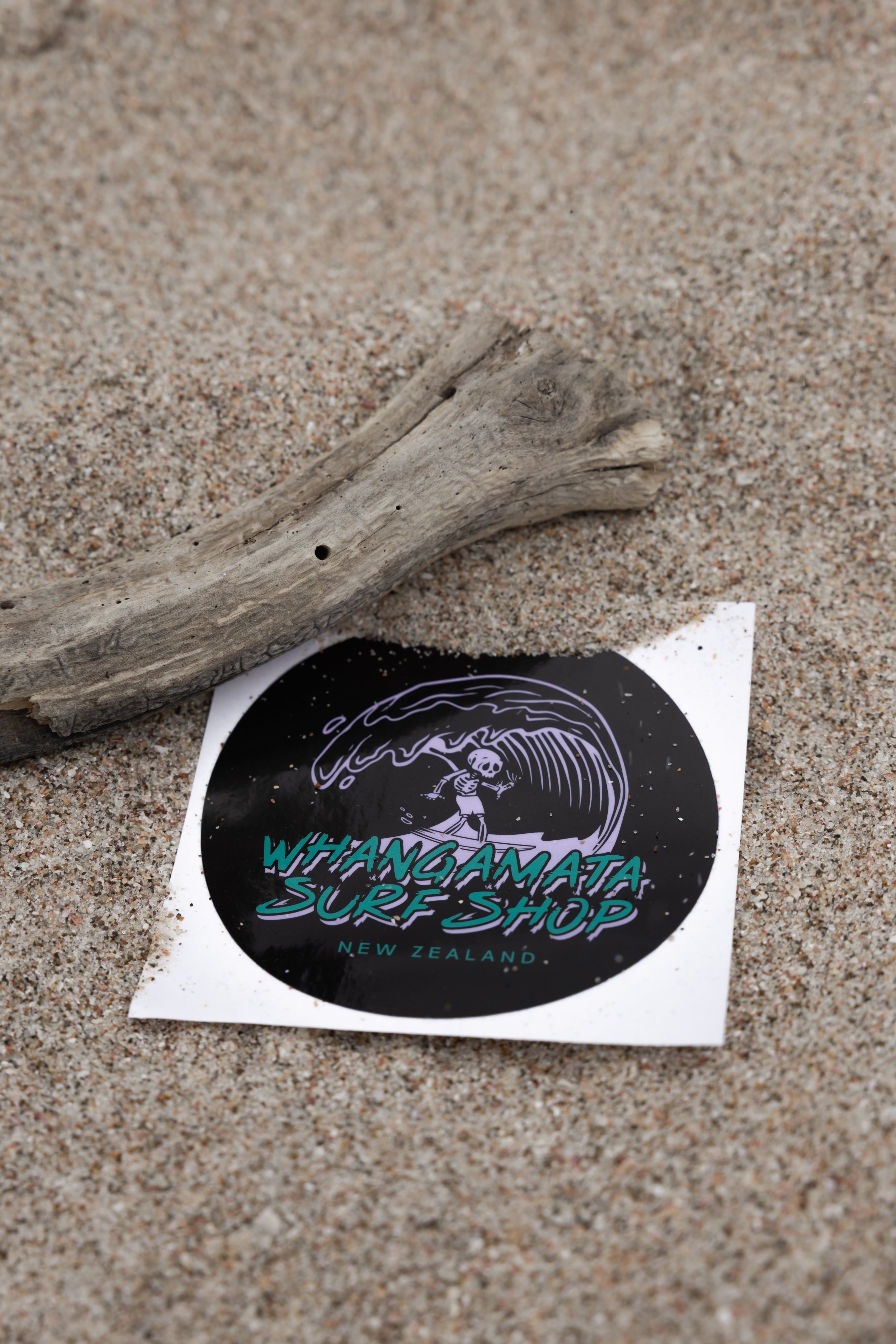 WHANGAMATA SURF SKELETON SURFER STICKER - BLACK