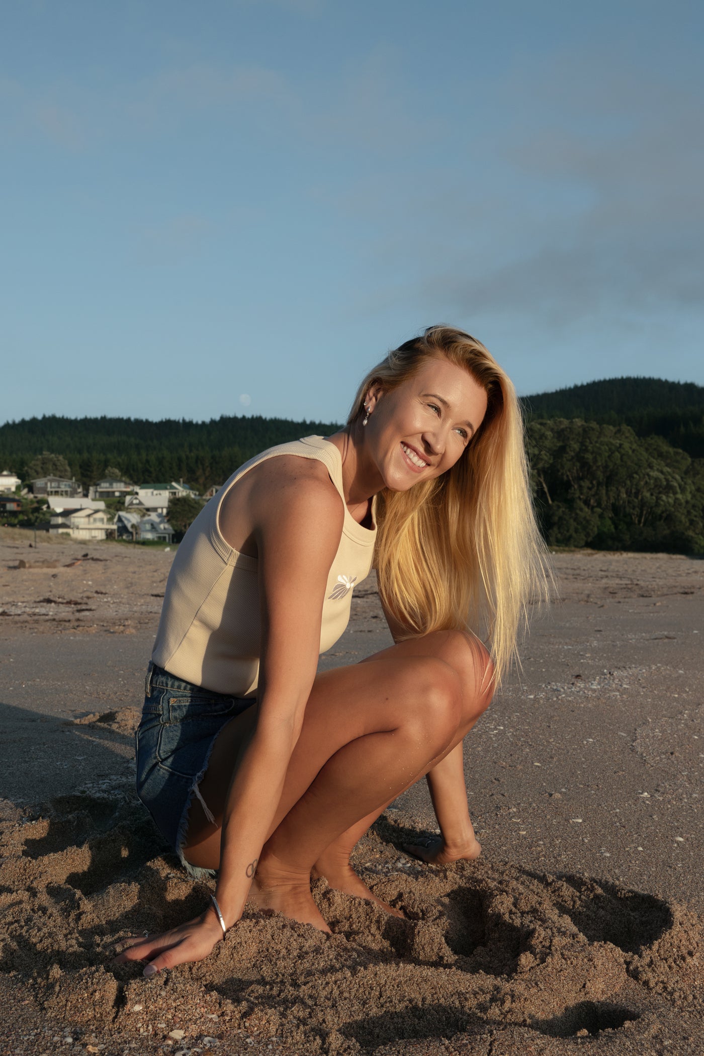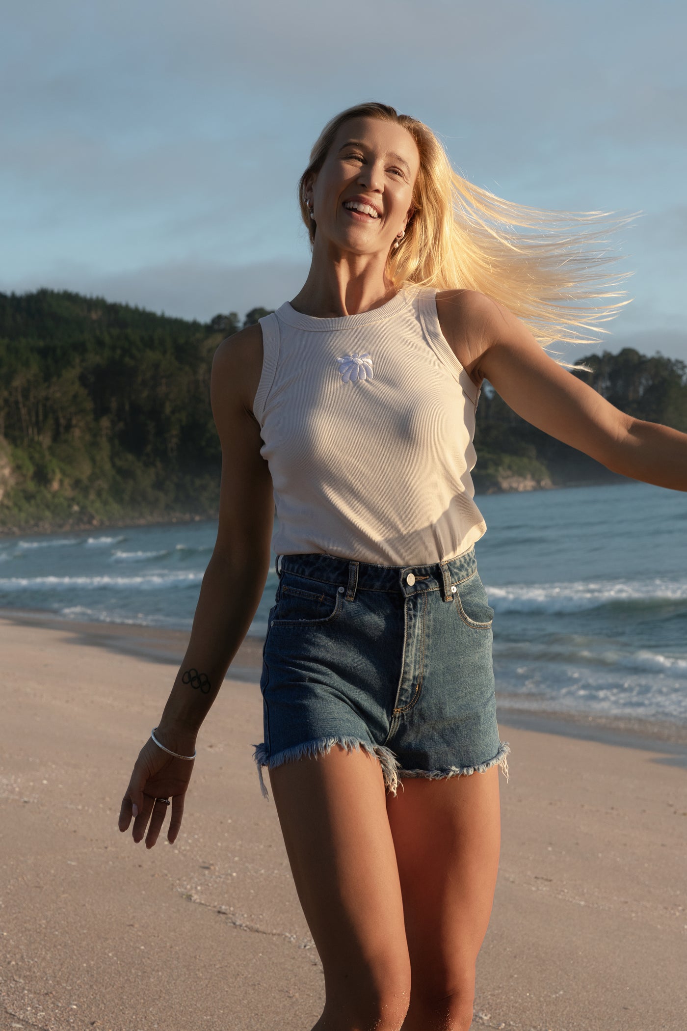 WHANGAMATA SURF SHOP RIBED FLOWER SINGLET - BONE