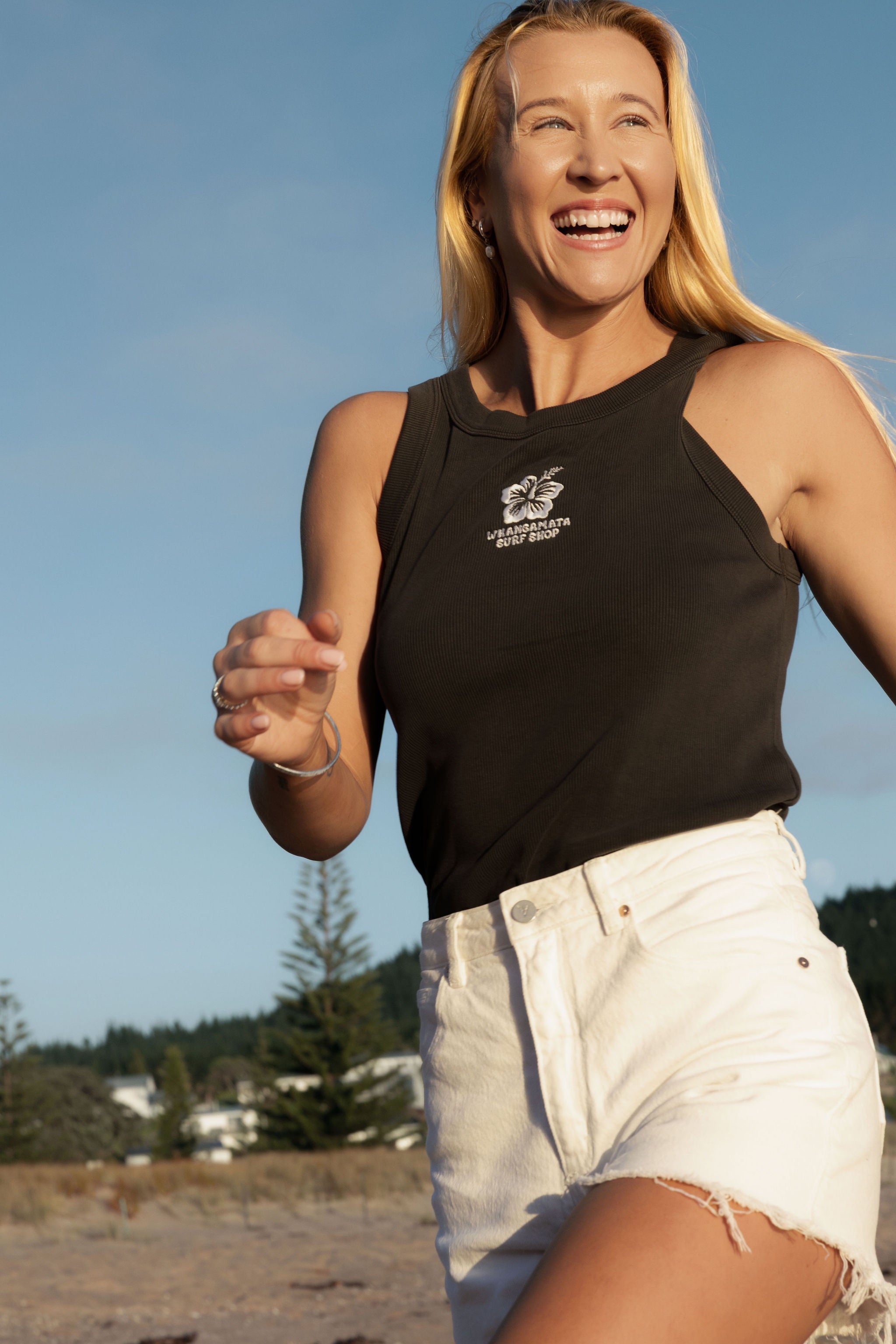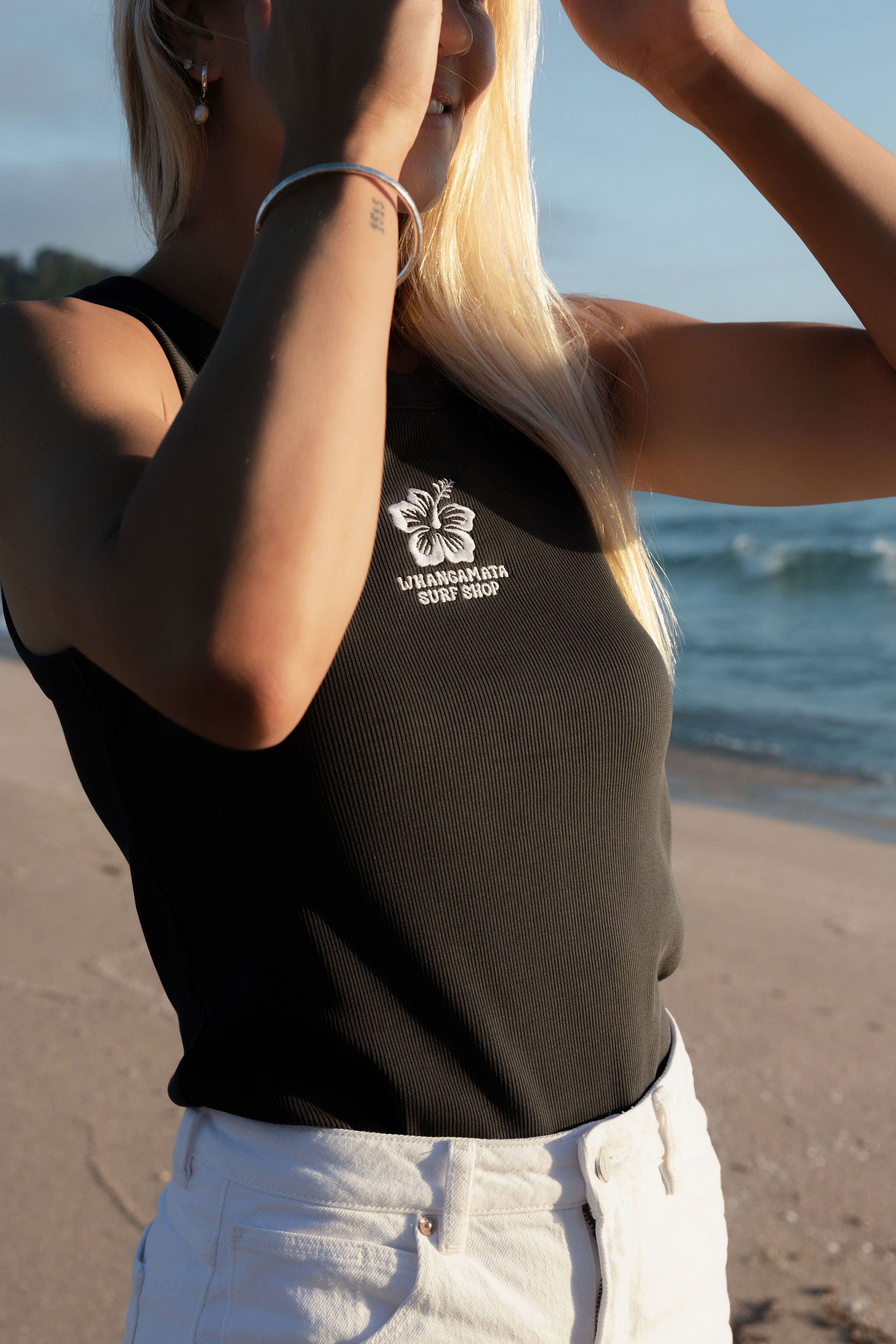 WHANGAMATA SURF SHOP HIBISCUS BLOOM ORGANIC RIBED SINGLET - FADED BLACK