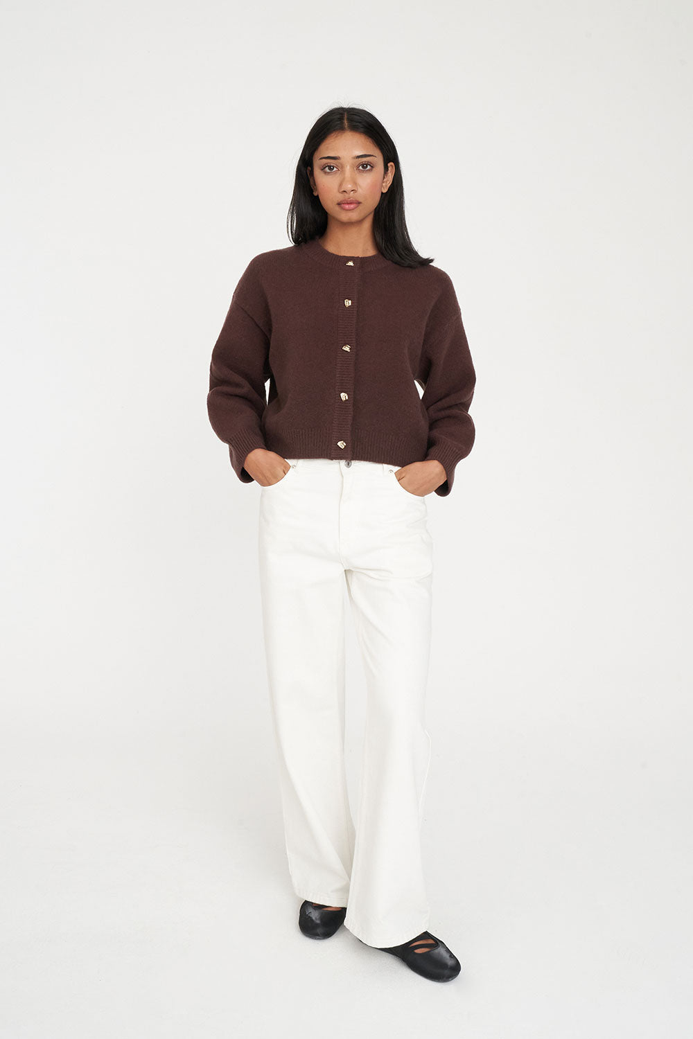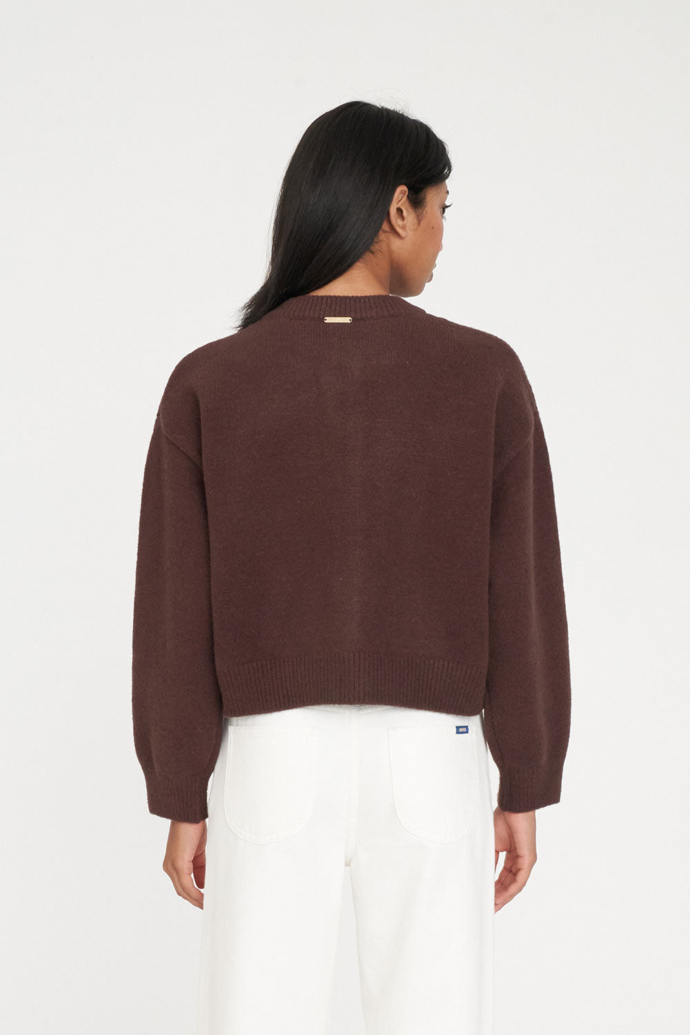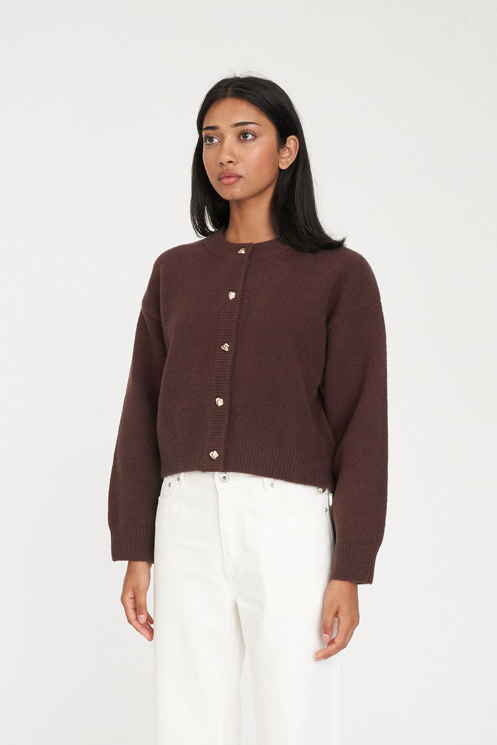 • What you need to know: 70% Acrylic 22% Nylon 5% Wool 3% Spandex, Fully fashioned knit, Relaxed fit, Crew neck, Button front placket, Straight sleeve, Huffer branded gold metal plate