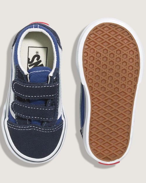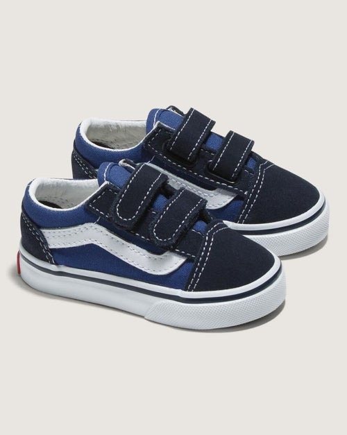 Strap Closures Create a Toddler-Friendly Fit on this Iconic Sidestripe Shoe. The Toddler Old Skool V reimagines our iconic Sidestripe shoe by swapping traditional laces for double hook-and-loop closures. Made with signature suede and canvas uppers, this low-top style maintains its classic appeal while providing an easy, secure fit that keeps your little one comfortable all day.
